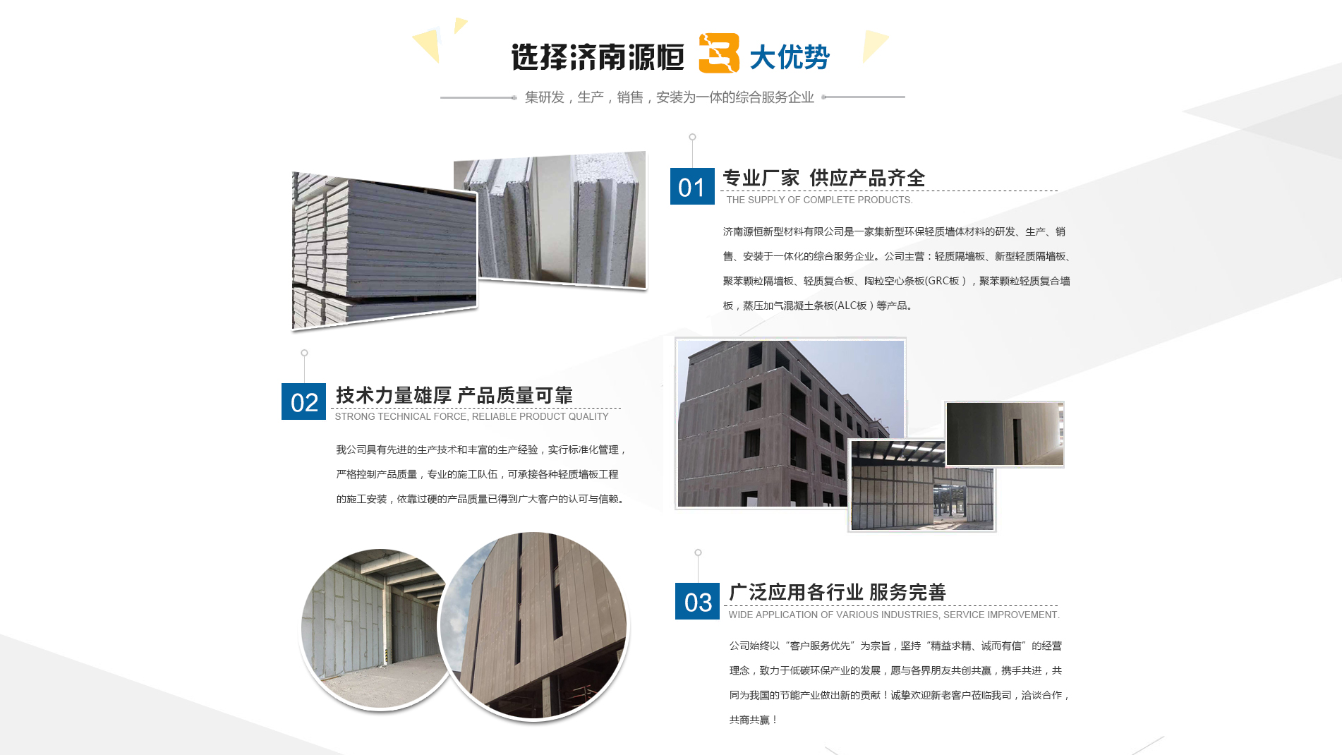 濟南源恒新型材料有限公司坐落于美麗的泉城濟南,是集新型環(huán)保輕質(zhì)墻體材料的研發(fā)、生產(chǎn)、銷售、安裝于一體化的綜合服務(wù)企業(yè)。我公司具有的生產(chǎn)技術(shù)和豐富的生產(chǎn)經(jīng)驗,為您提供輕質(zhì)隔墻板、新型輕質(zhì)隔墻板、聚苯顆粒隔墻板、輕質(zhì)復(fù)合板、陶粒空心條板(GRC板),聚苯顆粒輕質(zhì)復(fù)合墻板,蒸壓加氣混凝土條板(ALC板)等產(chǎn)品,本公司有專的施工隊伍,可承接各種輕質(zhì)墻板工程的施工安裝。輕質(zhì)隔墻板是國家推廣使用的新型輕質(zhì)、綠色無害建材,是墻改節(jié)能政策大力扶持的環(huán)保節(jié)能產(chǎn)品,是發(fā)達(dá)國家普遍采用的新型墻體材料。濟南源恒新型材料有限公司實行標(biāo)準(zhǔn)化管理,嚴(yán)格控制產(chǎn)品質(zhì)量,依靠過硬的產(chǎn)品質(zhì)量已得到廣大客戶的認(rèn)可與信賴。公司產(chǎn)品遍布各大城市,與國內(nèi)多家客戶建立了良好的合作關(guān)系。公司始終以“客戶服務(wù)優(yōu)先”為宗旨,堅持“精益求精、誠而有信”的經(jīng)營理念,致力于低碳環(huán)保產(chǎn)業(yè)的發(fā)展,愿與各界朋友共創(chuàng)共贏,攜手共進(jìn),共同為我國的節(jié)能產(chǎn)業(yè)做出新的...